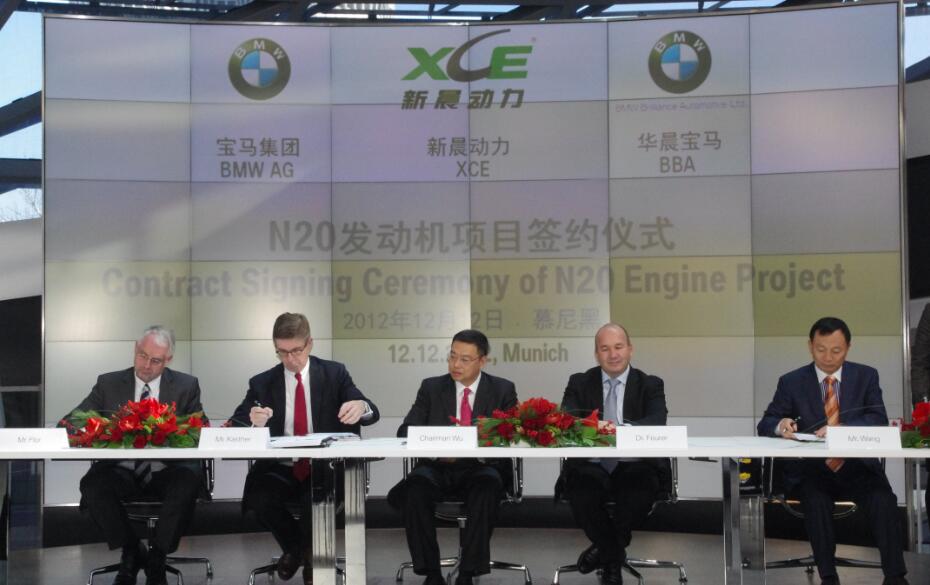 ????? 簽約儀式由寶馬集團(tuán)中國規(guī)劃部高級副總裁伍騰(Guenter Wollny)主持,時任寶馬集團(tuán)規(guī)劃部高級副總裁費(fèi)伊勒(Rainer Feurer)出席簽字儀式并代表寶馬集團(tuán)簽署合作協(xié)議和講話。華晨寶馬董事長吳小安、時任首席執(zhí)行官兼總裁康思遠(yuǎn)(Olaf Kastner)、時任副總裁方諾德(Knudt Flor)出席簽字儀式并代表華晨寶馬簽字。時任寶馬集團(tuán)發(fā)動機(jī)事業(yè)部高級副總裁海斯(Anton Heiss)代表寶馬發(fā)動機(jī)事業(yè)部簽字。